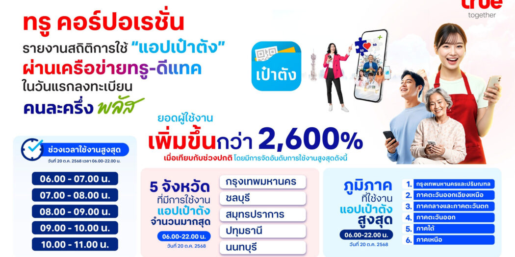 ทรู คอร์ปอเรชั่นเผยยอดคนใช้แอปเป๋าตังพุ่งกว่า 2600% ในวันแรกลงทะเบียน “คนละครึ่งพลัส”