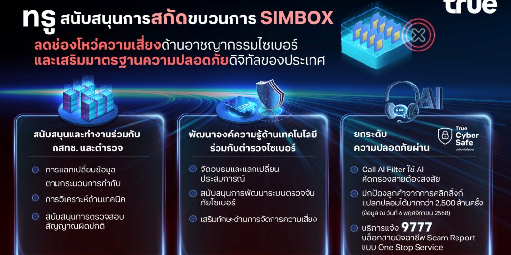 ทรู คอร์ปอเรชั่น เดินหน้าร่วมมือกับหน่วยงานภาครัฐในการป้องกันภัยไซเบอร์และโทรหลอกลวง ซึ่งสร้างความเดือดร้อนให้ประชาชนและส่งผลกระทบต่อความเชื่อมั่นในโลกดิจิทัลของประเทศ โดยล่าสุด สำนักงาน กสทช. และเจ้าหน้าที่ตำรวจ สามารถบุกเข้ายึดเครื่อง SIMBOX อุปกรณ์สำคัญที่ใช้ในการโทรหลอกลวง ได้ในพื้นที่จังหวัดสระแก้วและนนทบุรี ซึ่งปฏิบัติการนี้เป็นผลจากการแลกเปลี่ยนข้อมูลตามขั้นตอนทางกฎหมาย และการวิเคราะห์ทางเทคนิคร่วมกัน ระหว่างทรูและหน่วยงานที่เกี่ยวข้อง รวมถึงสนับสนุนการตรวจสอบสัญญาณผิดปกติ การทำงานอย่างใกล้ชิดนี้ช่วยตัดวงจรขบวนการคอลเซ็นเตอร์ที่สร้างความเดือดร้อนเสียหายให้กับคนไทยอย่าง เป็นรูปธรรม