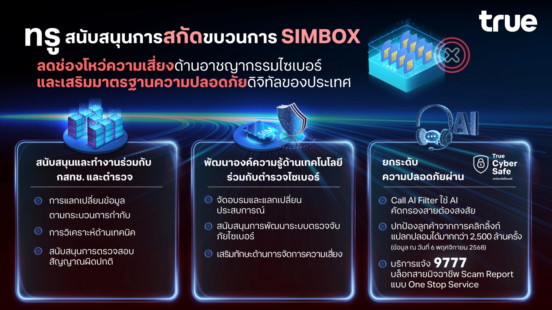 ที่ผ่านมา ทรู มุ่งมั่นสกัดกั้นกลโกงมิจฉาชีพที่ซับซ้อนและเปลี่ยนรูปแบบตลอดเวลา ควบคู่กับการยกระดับความปลอดภัยผ่าน True CyberSafe เกราะป้องกันภัยดิจิทัลสำหรับลูกค้าด้วยบริการ Call AI Filter คัดกรองสายต้องสงสัยด้วย AI และช่วยปกป้องลูกค้าจากการคลิกลิ้งก์แปลกปลอมไปแล้วกว่า 2,531,905,914 ล้านครั้ง (ข้อมูล ณ วันที่ 6 พฤศจิกายน 2568) นอกจากนี้ยังมีบริการแจ้ง 9777 บล็อกสายมิจฉาชีพ Scam Report แบบ