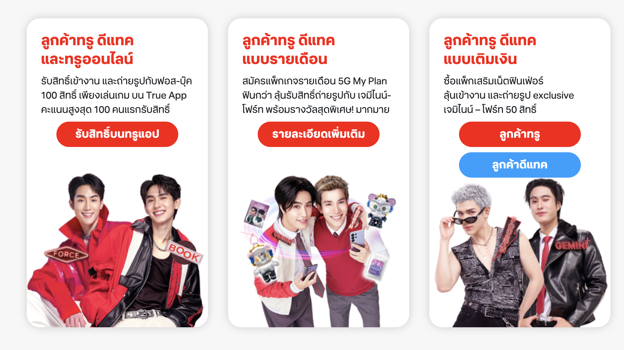 ลูกค้าทรู ดีแทค ทรูออนไลน์ ทรูวิชั่นส์ และทรู คอนเวอร์เจนซ์ สามารถร่วมกิจกรรมผ่าน True App เพื่อลงทะเบียนรับสิทธิ์เข้าร่วมแฟนปาร์ตี้ “TRUE DTAC5G FANDOM OF SMILE” ตั้งแต่วันที่ 1 ธันวาคม 2568 – 15 มกราคม 2569” รวมถึงกิจกรรม พิเศษยิ่งขึ้นใกล้ชิดยิ่งกว่า ร่วมสนุกลุ้นเป็น 100 คนที่ได้ถ่ายภาพคู่กับ ฟอส–บุ๊ค และ 100 คนที่ได้ถ่ายภาพคู่กับ ‘เจมีไนน์–โฟร์ท’ ตามรายละเอียดดังนี้