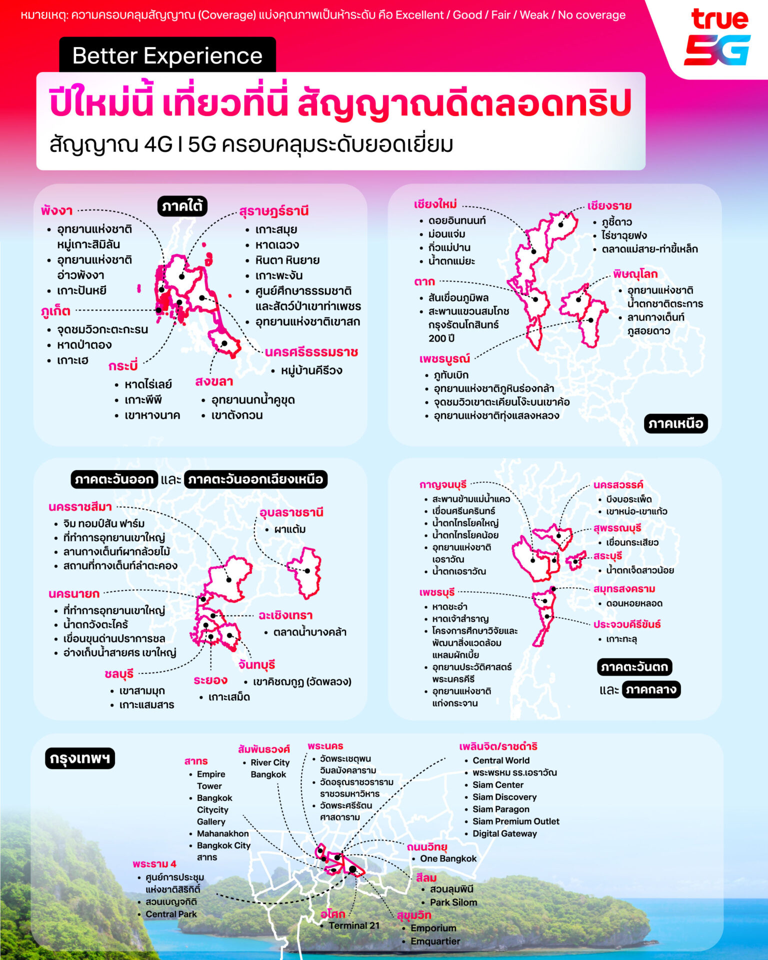 โครงข่าย 5G และ 4G ของทรู คอร์ปอเรชั่นได้รับการพัฒนาให้ครอบคลุมในระดับคุณภาพสูงในแหล่งท่องเที่ยวสำคัญทั่วประเทศ รองรับการเดินทางและการใช้งานในช่วงเทศกาลปีใหม่อย่างต่อเนื่อง ทั้งพื้นที่ธรรมชาติ เมืองท่องเที่ยวหลัก ศูนย์กลางเศรษฐกิจ และแลนด์มาร์กระดับประเทศ