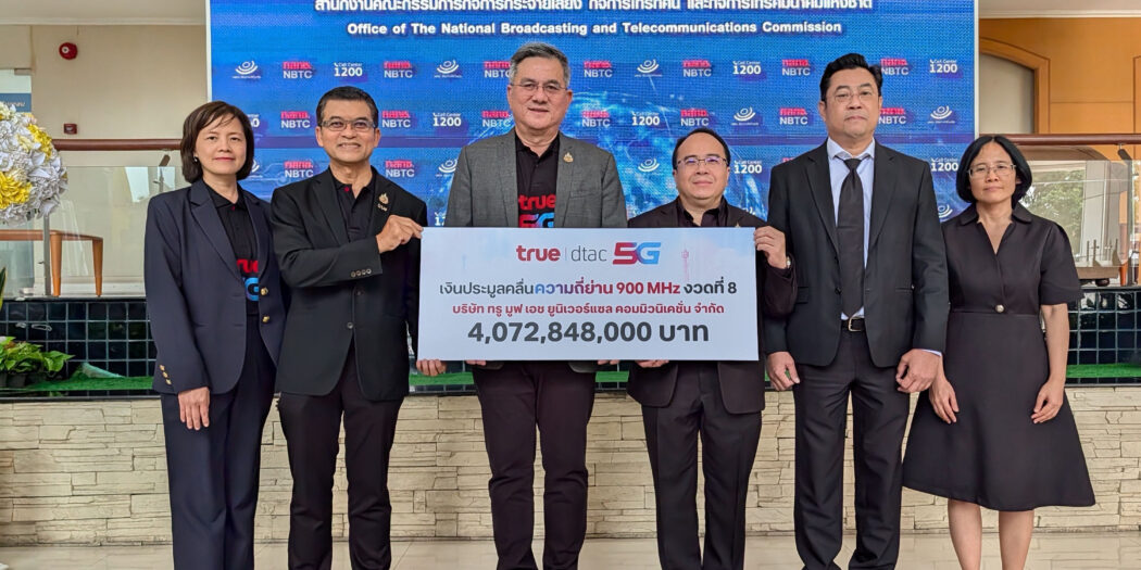 ทั้งนี้ บริษัท ทรู มูฟ เอช ยูนิเวอร์แซล คอมมิวนิเคชั่น จำกัด นำโดย นายจักรกฤษณ์ อุไรรัตน์ (ที่ 3 จากซ้าย) หัวหน้าคณะผู้บริหารด้านรัฐกิจสัมพันธ์ พร้อมด้วย นายนฤพนธ์ รัตนสมาหาร (ที่ 2 จากซ้าย) หัวหน้าสายงานรัฐกิจสัมพันธ์และกำกับดูแล และ นางสาวกนกพร คุณชัยเจริญกุล (ซ้ายสุด) หัวหน้าสายงานกลยุทธ์กฎระเบียบการกำกับดูแลกิจการ เข้ายื่นชำระค่าคลื่นความถี่ย่าน 900 MHz งวดที่ 8 ต่อสำนักงาน กสทช. โดยมี นายสุทธิศักดิ์ ตันตะโยธิน (ที่ 4 จากซ้าย) รองเลขาธิการ กสทช. สายงานกิจการโทรคมนาคม เป็นผู้รับมอบ พร้อมด้วย นายภูมิภัส พลการ (ที่ 5 จากซ้าย) ผู้อำนวยการสำนักสื่อสารองค์กร และ นางพุธชาด แมนมนตรี (ขวาสุด) ผู้อำนวยการสำนักการอนุญาตประกอบกิจการโทรคมนาคม 1 (ปท.1) ณ สำนักงาน กสทช. เมื่อวันที่ 26 ธันวาคม 2568