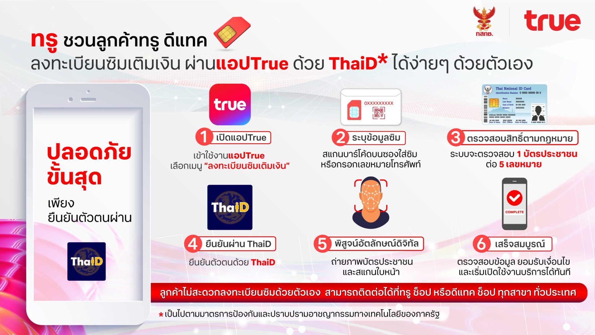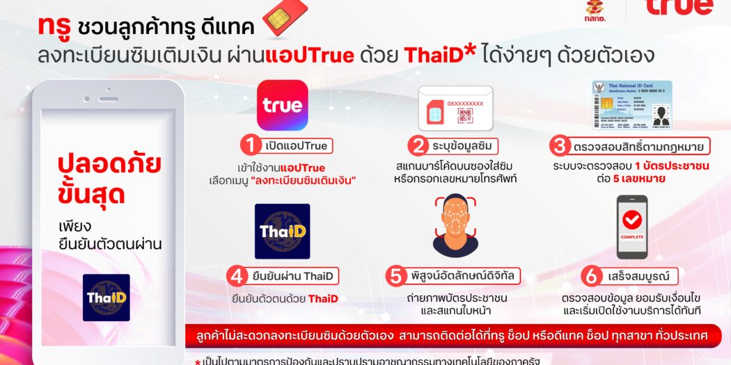 จากมาตรการป้องกันและปราบปรามอาชญากรรมทางเทคโนโลยีของภาครัฐที่ร่วมบูรณาการพลังจากทุกภาคส่วน เพื่อยกระดับการป้องกันภัยคุกคามทางไซเบอร์ให้สามารถดำเนินการได้อย่างมีประสิทธิภาพ  ทรู คอร์ปอเรชั่น พร้อมขานรับและปฏิบัติตามนโยบายอย่างเคร่งครัด  เพื่อปกป้องสิทธิ์และคุ้มครองข้อมูลส่วนบุคคลสูงสุด โดยให้ตัวแทนจำหน่ายทั่วประเทศจะต้องมีการลงทะเบียนซิมด้วยเครื่องอ่านบัตรประชาชน (Smart Card Reader) และอำนวยความสะดวกให้ลูกค้าสามารถลงทะเบียนซิมเติมเงินได้ด้วยตัวเองง่ายๆ ทุกที่ ทุกเวลา  ผ่านแอปTrue ที่จะยืนยันตัวตนด้วยThaiD ซึ่งจะช่วยเพิ่มความปลอดภัยในการใช้งาน เป็นเกราะป้องกันภัยจากมิจฉาชีพที่แข็งแกร่ง พร้อมมอบประสบการณ์ดิจิทัลที่ใช้งานง่าย เชื่อถือได้ และมั่นใจได้เสมือนการติดต่อทำรายการด้วยตนเองที่ช็อป  ลูกค้าทรู ดีแทค เริ่มใช้งานได้แล้ววันนี้