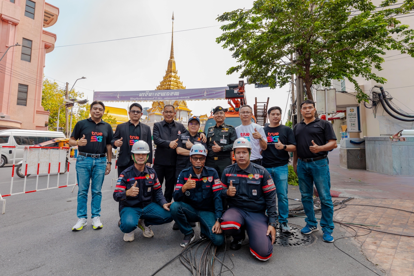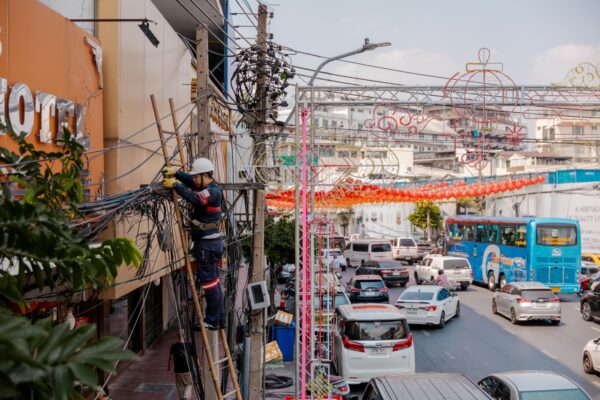 ทรู คอร์ปอเรชั่น ผนึกความร่วมมือกับ สำนักงานคณะกรรมการกิจการกระจายเสียง กิจการโทรทัศน์ และกิจการโทรคมนาคมแห่งชาติ (กสทช.) และการไฟฟ้านครหลวง (MEA) และพันธมิตร เพื่อร่วมเฉลิมฉลองเทศกาลตรุษจีน เปิดศักราชรับปีม้ามงคล เดินหน้าปฏิบัติการรื้อถอนและนำสายสื่อสารลง ใต้ดิน เนรมิตทัศนียภาพของแหล่งท่องเที่ยวสำคัญให้สวยงามและปลอดภัย พร้อมต้อนรับนักท่องเที่ยวจาก ทั่วทุกมุมโลกในเทศกาลตรุษจีน ปี 2569 โดยได้รับเกียรติจาก นายสุทธิศักดิ์ ตันตะโยธิน (ที่ 4 จากซ้าย) รองเลขาธิการ กสทช. นายราเชนทร์ อันเวช (ที่ 3 จากซ้าย) รองผู้ว่าการเทคโนโลยีดิจิทัลและระบบสื่อสาร การไฟฟ้านครหลวง (MEA) และนายกนกศักดิ์ นิ่มนวลรัตน์ (ที่ 2 จากซ้าย) หัวหน้าฝ่าย รัฐกิจและสาธารณูปโภค บจม.ทรู คอร์ปอเรชั่น นำทีมวิศวกรลงพื้นที่ปฏิบัติการอย่างใกล้ชิด พร้อมติดตามความคืบหน้าและสนับสนุนการดำเนินงานบริเวณพื้นที่ถนนเยาวราช