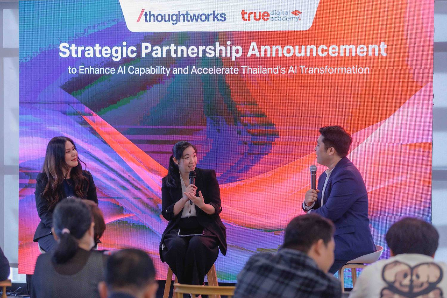 ความร่วมมือครั้งนี้ เป็นอีกหนึ่งความก้าวหน้าครั้งสำคัญของ ทรู ดิจิทัล อคาเดมี ที่จะเสริมพลังความแข็งแกร่ง เพื่อเดินหน้าพันธกิจในการพัฒนาศักยภาพด้าน AI (AI Capability) ขององค์กรในประเทศไทย ผ่านการผนึกพลังกับ Thoughtworks 3 ด้านหลัก คือ 1) การพัฒนาหลักสูตรและเนื้อหาการเรียนรู้ร่วมกัน ภายใต้มาตรฐานและการกำกับดูแลจากผู้เชี่ยวชาญของ Thoughtworks เพื่อให้เนื้อหามีความทันสมัย เชื่อมโยงกับการใช้งานในระดับองค์กร และสอดคล้องกับบริบทธุรกิจจริง โดย Thoughtworks ร่วมทบทวนและพัฒนาหลักสูตร พร้อมถ่ายทอดองค์ความรู้ทางเทคนิคเชิงลึกสู่การประยุกต์ใช้จริง 2) การเรียนรู้จากกรณีศึกษาและประสบการณ์จากโครงการจริงที่เกิดขึ้นในหลากหลายอุตสาหกรรมทั่วโลก ผสมผสานกับประสบการณ์การทำงานร่วมกับองค์กรทุกขนาดที่มีระดับความพร้อมด้าน AI ที่เเตกต่างกัน เพื่อช่วยให้องค์กรเข้าใจ เเละสามารถประยุกต์ใช้ AI เข้ากับบริบททางธุรกิจเเละ กระบวนการทำงานได้อย่างเเม่นยำ พร้อมทั้งแบ่งปันมุมมองจากผู้เชี่ยวชาญด้านเทคโนโลยีระดับโลก ที่ช่วยส่งเสริมการคิดค้นและพัฒนานวัตกรรม AI ในองค์กร และสร้างผลลัพธ์เชิงธุรกิจได้อย่างเป็นรูปธรรม และ 3) สนับสนุนการพัฒนาศักยภาพด้าน AI ขององค์กรอย่างเป็นระบบ ทำให้องค์กรสามารถขับเคลื่อนการเปลี่ยนแปลงในมิติของบุคลากร เข้าใจบทบาทสำคัญของเทคโนโลยีกับธุรกิจ เพื่อขับเคลื่อน AI Transformation อย่างยั่งยืน โดยเน้นยำเรื่องวัฒนธรรมความปลอดภัย เเละการให้มนุษย์เป็นศูนย์กลาง เชื่อมการเรียนรู้สู่การใช้งานจริง เตรียมความพร้อมในการสร้าง บริหาร และขยายระบบ AI ในระดับองค์กร