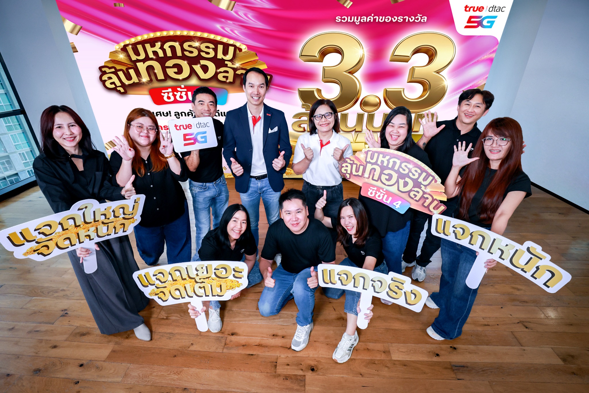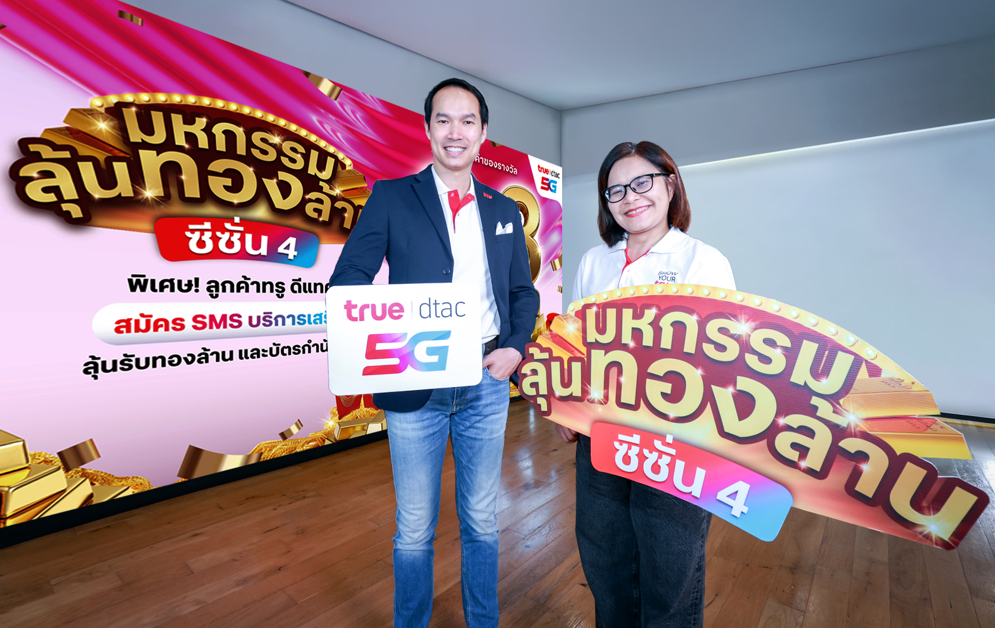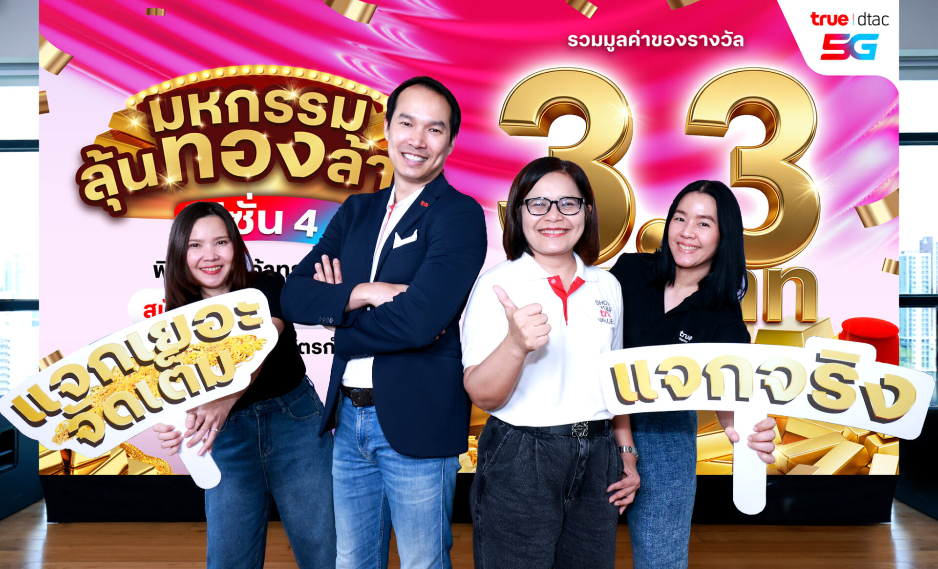 ส่งต่อความเฮงแบบฉุดไม่อยู่! ทรู5G โดยคุณภูริโชติ วงศ์โกมลเชษฐ์หัวหน้าฝ่ายบริการดิจิทัล และ คุณสุนิษา อนันทนุพงศ์ หัวหน้ากลุ่มงานโมบายล์คอนเทนต์ บมจ. ทรู คอร์ปอเรชั่น จับมือ 6 พันธมิตรผู้ให้บริการคอนเทนต์ชั้นนำ เปิดตัวแคมเปญใหญ่แห่งปี “มหกรรมลุ้นทองล้าน ซีซั่น 4” ขนรางวัลทองคำมูลค่าหลักล้านและบัตรของขวัญรวมมูลค่ามหาศาลมาแจกลูกค้าแบบจัดเต็ม ตอกย้ำความมุ่งมั่นในการส่งมอบความสุขและสิทธิพิเศษที่เหนือกว่า ตอบโจทย์ไลฟ์สไตล์ลูกค้าสายมูและคนชอบลุ้นทั่วประเทศ แจกจริง 30 รางวัลใหญ่ รวมมูลค่ากว่า 3.3 ล้านบาท