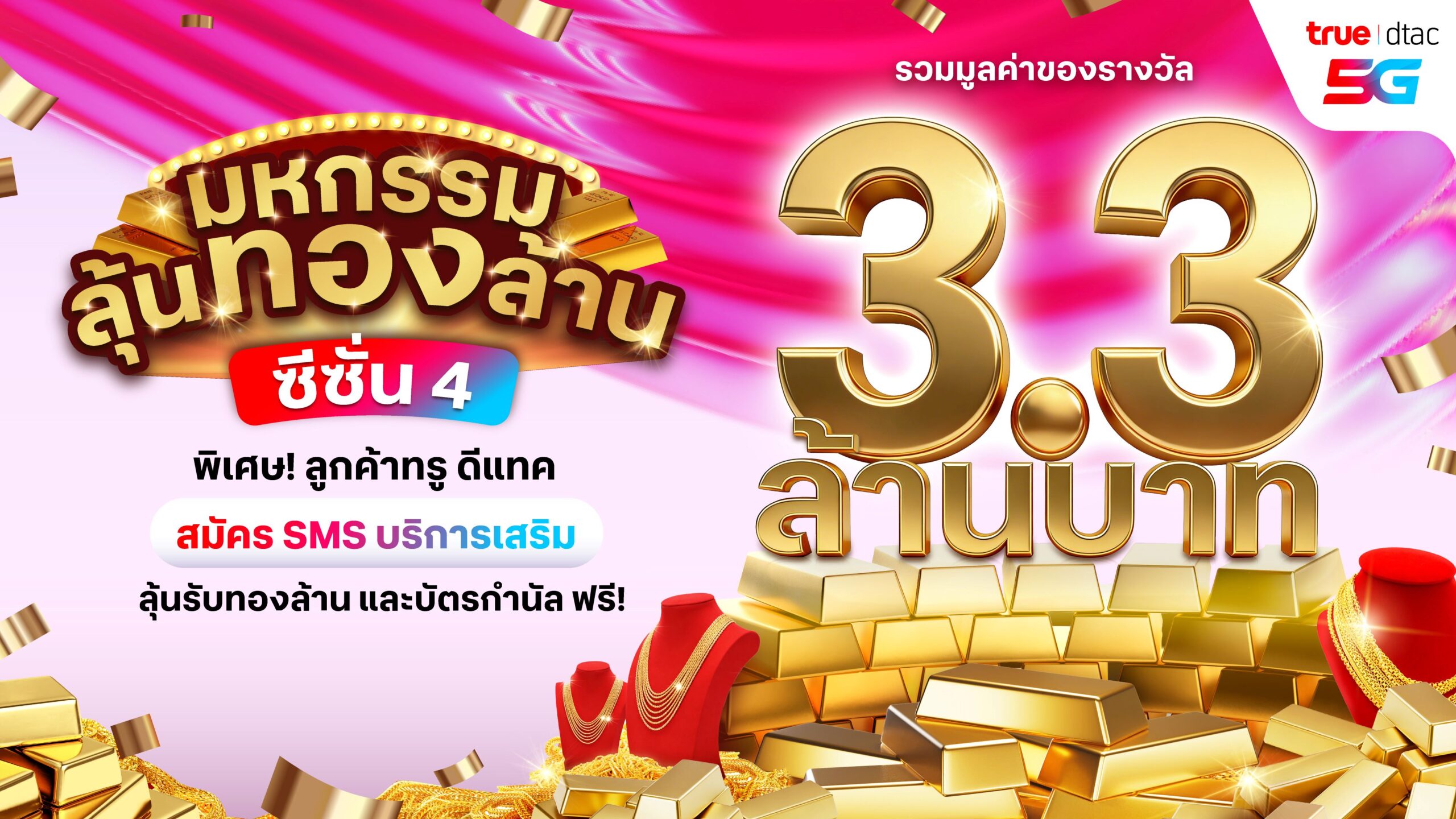 ลูกค้าทรู ดีแทคสามารถร่วมสนุกกับกิจกรรมที่ชื่นชอบได้ง่ายๆ เพียงสมัครบริการเสริมทาง SMS เพื่อรับสิทธิ์ลุ้นรับรางวัลใหญ่ทองคำมูลค่า 100,000 บาทจำนวน 30 รางวัล และรางวัลอื่นๆ อีกมากมาย ตั้งแต่วันนี้ ถึง 31 กรกฎาคม 2569 เท่านั้น