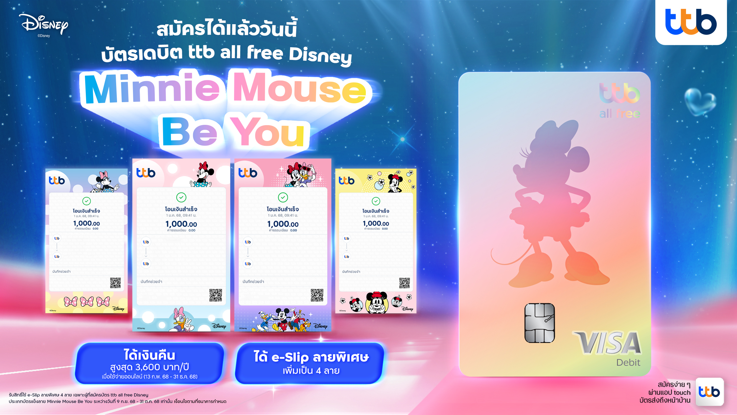 บัตรเดบิต ทีทีบี ออลล์ฟรี ดิสนีย์ ลาย “มินนี่ เมาส์ บี ยู” พร้อมให้ลูกค้าสมัครได้ด้วยตนเองทางแอป ทีทีบี ทัช เว็บไซต์ทีทีบี หรือที่ทีทีบีทุกสาขา ตั้งแต่วันที่ 9 กันยายน 2568 นี้เป็นต้นไป บัตรเดบิต ทีทีบี ออลล์ฟรี ดิสนีย์ บัตรเดียวที่ตอบโจทย์ทุกไลฟ์สไตล์ให้คุณใช้ชีวิตทางการเงินได้อัศจรรย์ พร้อมรับสิทธิประโยชน์แบบจัดเต็มมากมาย รวมทั้งกิจกรรมและแคมเปญแบบเอ็กซ์คลูซีฟอย่างต่อเนื่องที่จะทำให้ลูกค้าเข้าถึงประสบการณ์ความสนุก ความคุ้มค่าจากการใช้จ่ายในทุก ๆ วัน ตลอดทั้งปี ดูรายละเอียดเพิ่มเติมได้ที่ https://www.ttbbank.com/th/personal/deposits/debit-card/ttb-all-free-disney-debit-cards
