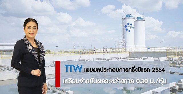 บริษัท ทีทีดับบลิว จำกัด (มหาชน) หรือ TTW ผู้ผลิตน้ำประปาภาคเอกชนรายใหญ่ที่สุดของประเทศ ในพื้นที่สมุทรสาคร – นครปฐม และปทุมธานี – รังสิต เผยผลประกอบการครึ่งปีแรก ประจำปี 64 บริษัทฯ และบริษัทย่อยมีรายได้รวม 2,949.1 ล้านบาท กำไรสุทธิ 1,558.3 ล้านบาท พร้อมเตรียมจ่ายปันผลระหว่างกาล 0.30 บ./หุ้น