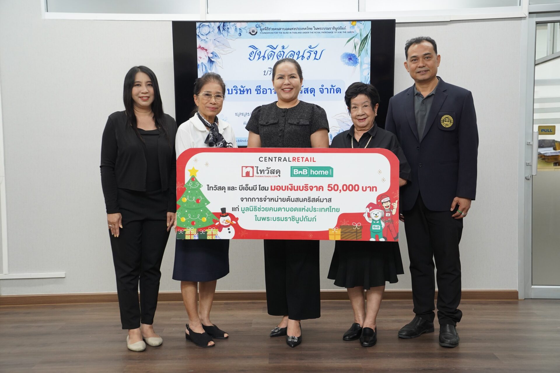 นางสาวชุติพร คงเจริญสุข ผู้ช่วยกรรมการผู้จัดการใหญ่ ฝ่ายการตลาด บริษัท ซีอาร์ซี ไทวัสดุ จำกัด ในเครือเซ็นทรัล รีเทล ผู้นำธุรกิจค้าปลีกวัสดุก่อสร้างและสินค้าตกแต่งบ้าน (ลำดับที่ 3 จากซ้าย) มอบเงินบริจาคมูลค่า 50,000 บาท ให้แก่ มูลนิธิช่วยคนตาบอดแห่งประเทศไทย ในพระบรมราชินูปถัมภ์ เพื่อร่วมสนับสนุนการดำเนินโครงการช่วยเหลือผู้พิการทางสายตาอย่างต่อเนื่องเข้าสู่ปีที่ 7 ผ่านการจำหน่ายต้นคริสต์มาส ที่เป็นต้นสนสดนำเข้าจากประเทศแคนาดาและจัดจำหน่ายผ่านโมเดิร์นเทรดไทวัสดุและบีเอ็นบี โฮม ทุกสาขาทั่วประเทศ โดยมี นางณัฏฐา มะระกานนท์ รองประธานกรรมการ มูลนิธิช่วยคนตาบอดแห่งประเทศไทย ในพระบรมราชินูปถัมภ์ (ลำดับที่ 2 จากซ้าย) และ นางสาวจรัสศรี ศรีมณี ผู้อำนวยการสำนักบริหารมูลนิธิช่วยคนตาบอดแห่งประเทศไทย ในพระบรมราชินูปถัมภ์ (ลำดับที่ 4 จากซ้าย) เป็นผู้รับมอบพร้อมคณะ เมื่อเร็ว ๆ นี้ ณ มูลนิธิช่วยคนตาบอดแห่งประเทศไทย ในพระบรมราชินูปถัมภ์