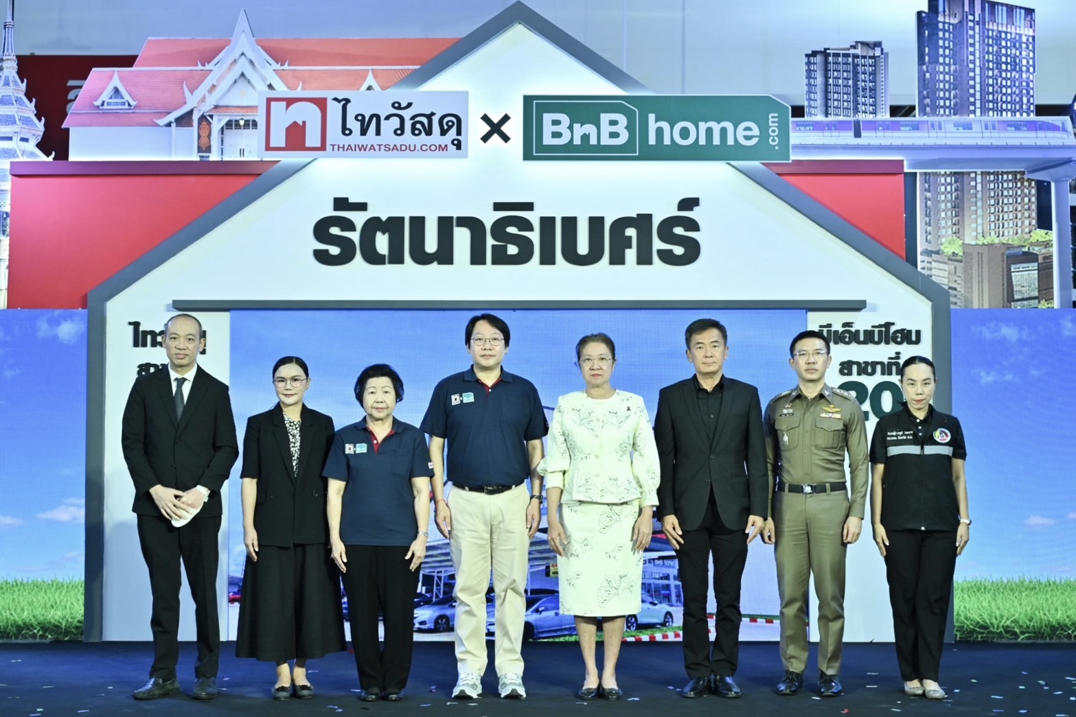 นายธนวัฒน์ จิรังคพัฒน์ กรรมการผู้จัดการใหญ่ บริษัท ซีอาร์ซี ไทวัสดุ จำกัด ในเครือเซ็นทรัล รีเทล (ลำดับที่ 4 จากซ้าย) พร้อมคณะผู้บริหารร่วมเปิด ไทวัสดุ x บีเอ็นบี โฮม สาขารัตนาธิเบศร์ ซึ่งนับเป็นไทวัสดุ สาขาที่ 90 และบีเอ็นบี โฮม สาขาที่ 20 ของประเทศ รวมถึงยังเป็นสาขาอันดับที่ 7 ของจังหวัดนนทบุรี เป็นอีกก้าวสำคัญของไทวัสดุในการขยายโมเดิร์นเทรดค้าปลีกวัสดุก่อสร้างและสินค้าเพื่อบ้านครบวงจรที่ครบครันด้วยไลน์สินค้าวัสดุก่อสร้าง เครื่องมือช่าง เครื่องใช้ไฟฟ้า สุขภัณฑ์ เฟอร์นิเจอร์ และสินค้าเพื่อบ้านกว่า 50,000 รายการ รวมทั้งยังหนุนการสร้างงานในพื้นที่กว่า 200 อัตรา พร้อมสนับสนุนการเติบโตในภาคอสังหาริมทรัพย์และรองรับการขยายตัวของจังหวัด โดยในพิธีเปิดงาน ไทวัสดุ x บีเอ็นบี โฮม สาขารัตนาธิเบศร์ ได้รับเกียรติจาก นางระวีพรรณ แก้วเพียงเพ็ญ รองผู้ว่าราชการจังหวัดนนทบุรี (ลำดับที่ 5 จากซ้าย) ร่วมเป็นประธานเปิดงาน พร้อมด้วยผู้บริหารจากหน่วยงานภาครัฐและเอกชนที่มาร่วมแสดงความยินดี เมื่อเร็ว ๆ นี้ ณ ไทวัสดุ x บีเอ็นบี โฮม สาขารัตนาธิเบศร์ ถนนรัตนาธิเบศร์ ตำบลบางกระสอ อำเภอเมืองนนทบุรี จังหวัดนนทบุรี