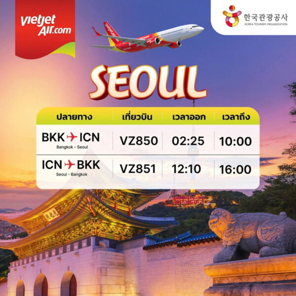 ทั้งนี้ เวียตเจ็ทไทยแลนด์ให้บริการเที่ยวบินตรงระหว่างกรุงโซลและกรุงเทพฯ โดยมีตารางบินดังนี้