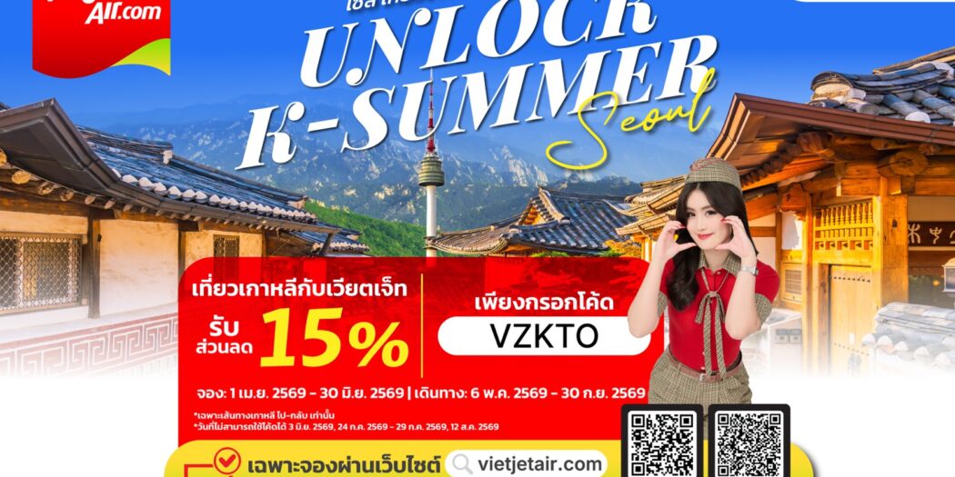 เวียตเจ็ทไทยแลนด์ ร่วมกับองค์การส่งเสริมการท่องเที่ยวเกาหลี (Korea Tourism Organization หรือ KTO) เปิดตัวแคมเปญ “Unlock K-Summer Seoul with Vietjet Thailand x KTO” มอบส่วนลด 15% สำหรับเที่ยวบินไป-กลับ ระหว่างกรุงเทพฯ และกรุงโซล ประเทศเกาหลีใต้ เมื่อทำการจองบัตรโดยสารและกรอกรหัส “VZKTO” ผ่านเว็บไซต์หรือแอปพลิเคชันของเวียตเจ็ทไทยแลนด์ ตั้งแต่วันนี้ – 30 มิถุนายน 2569 เพื่อกระตุ้นการเดินทางท่องเที่ยวของนักท่องเที่ยวไทยสู่ประเทศเกาหลีใต้ในช่วงฤดูร้อน พร้อมยกระดับการเชื่อมโยงระหว่างประเทศไทยและเกาหลีใต้ในทุกมิติ