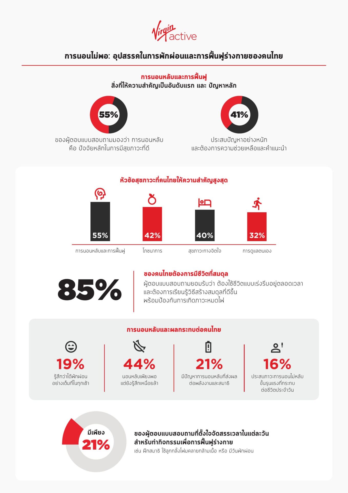 แคมเปญนี้ตอกย้ำถึงความจำเป็นเร่งด่วนในการสร้างสมดุลชีวิต ท่ามกลางวัฒนธรรมการทำงานแบบ ‘ไม่เคยปิดสวิตช์’ (Always-On Culture) ในปัจจุบัน โดยจากผลสำรวจล่าสุดของ เวอร์จิ้น แอ็คทีฟ ที่สำรวจผู้บริโภคชาวไทยกว่า 1,000 คน พบว่ามากกว่าครึ่ง (55%) ระบุว่าการนอนและการฟื้นฟูร่างกาย คือหัวใจสำคัญที่สุดของการมีสุขภาพและความเป็นอยู่ที่ดี ตามมาด้วยโภชนาการ (42%) และสุขภาวะทางจิต (40%) อย่างไรก็ตาม แม้จะตระหนักถึงความสำคัญดังกล่าว แต่กว่า 2 ใน 3 (70%) ของผู้ตอบแบบสอบถามยอมรับว่าตนเองเร่งรีบอยู่ตลอดเวลา และต้องการเรียนรู้วิธีการใช้ชีวิตให้ช้าลงเพื่อป้องกันภาวะหมดไฟ (Burnout)