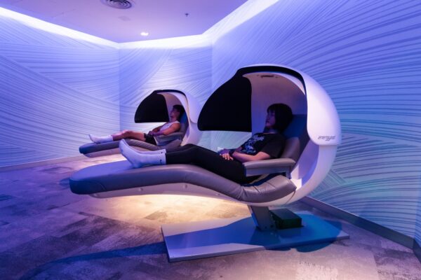 • Sleep Pods เทคโนโลยีไร้แรงโน้มถ่วง พร้อมเสียงบรรยากาศและแรงสั่นเบา ๆ เพื่อสนับสนุนการงีบหลับ ช่วยให้สมาชิกสามารถชาร์จพลังได้อย่างรวดเร็ว
