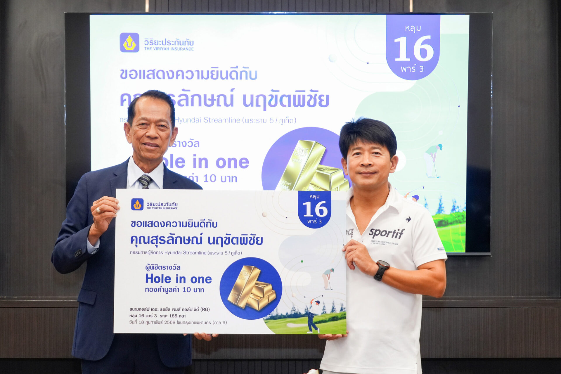 นายสุรลักษณ์ นฤขัตพิชัย กรรมการผู้จัดการ Hyundai Streamline (พระราม 5 และภูเก็ต) รับมอบรางวัลทองคำหนัก 10 บาท จาก บริษัท วิริยะประกันภัย จำกัด (มหาชน) โดยได้รับเกียรติจาก นายสยม โรหิตเสถียร รองกรรมการผู้จัดการ เป็นผู้แทนมอบ เพื่อแสดงความยินดีเนื่องในโอกาสที่สามารถทำ Hole in One หลุม 16 พาร์ 3 ระยะ 185 หลา ของสนามกอล์ฟ The Royal Gems Golf City ได้สำเร็จ ภายในการแข่งขัน “Viriyah Invitational Golf Tournament 2025” โซนกรุงเทพฯ และปริมณฑล โดยพิธีมอบจัดขึ้น ณ บริษัท วิริยะประกันภัย จำกัด (มหาชน) สำนักงานใหญ่ ถนนรัชดาภิเษก กรุงเทพฯ