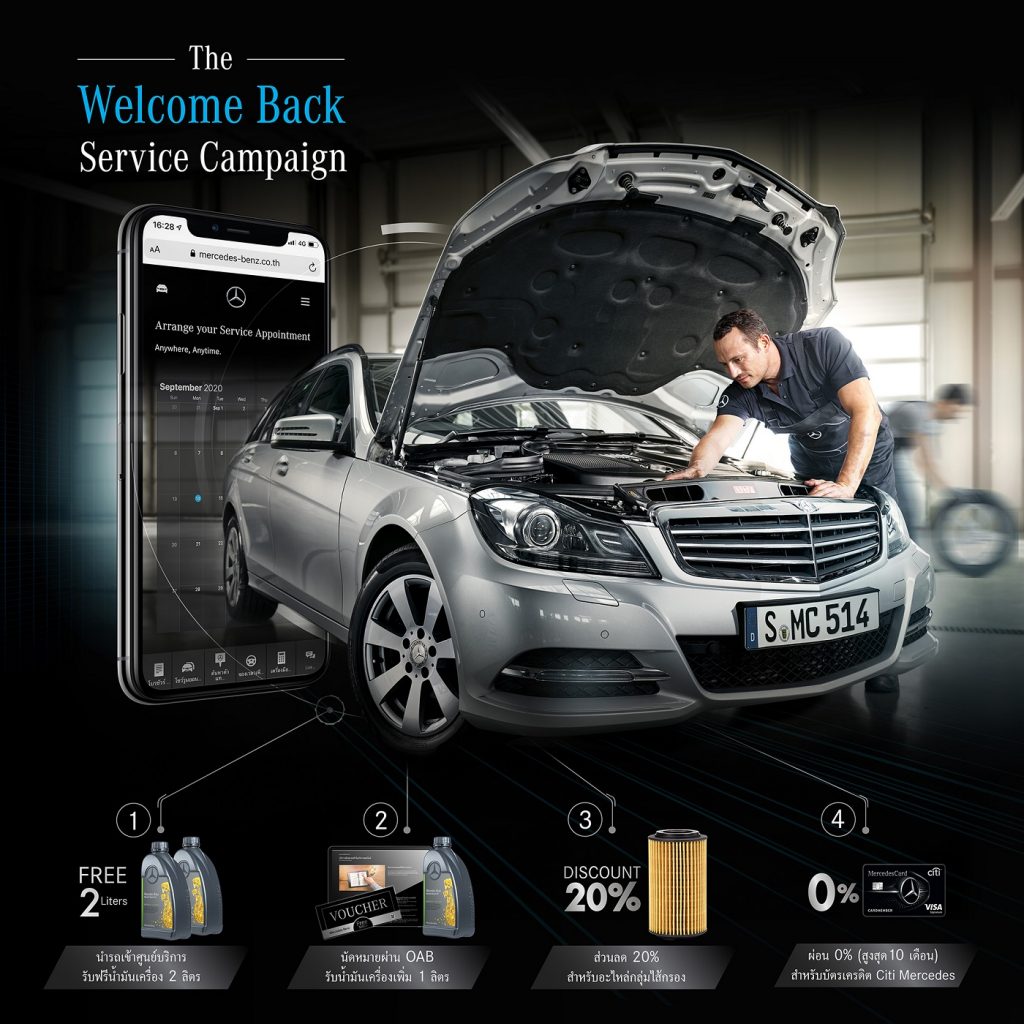 แม้จะอยู่ในช่วงเวลาที่ทุกคนต้องเว้นระยะห่างทางสังคมและเฝ้าระวังกันอย่างต่อเนื่อง เพื่อเป็นการมอบบริการสุดพิเศษ เมอร์เซเดส-เบนซ์จึงเสนอแคมเปญ “Welcome Back Service Campaign” สำหรับรถยนต์เมอร์เซเดส-เบนซ์ที่ถึงเวลาต้องเข้ารับบริการบำรุงรักษาตามระยะทาง เพื่อดูแลความพร้อมในการใช้รถยนต์ในทุก ๆ เส้นทางกับข้อเสนอพิเศษมากมายเมื่อเข้ารับบริการที่ศูนย์บริการเมอร์เซเดส-เบนซ์อย่างเป็นทางการทั่วประเทศ ได้แก่