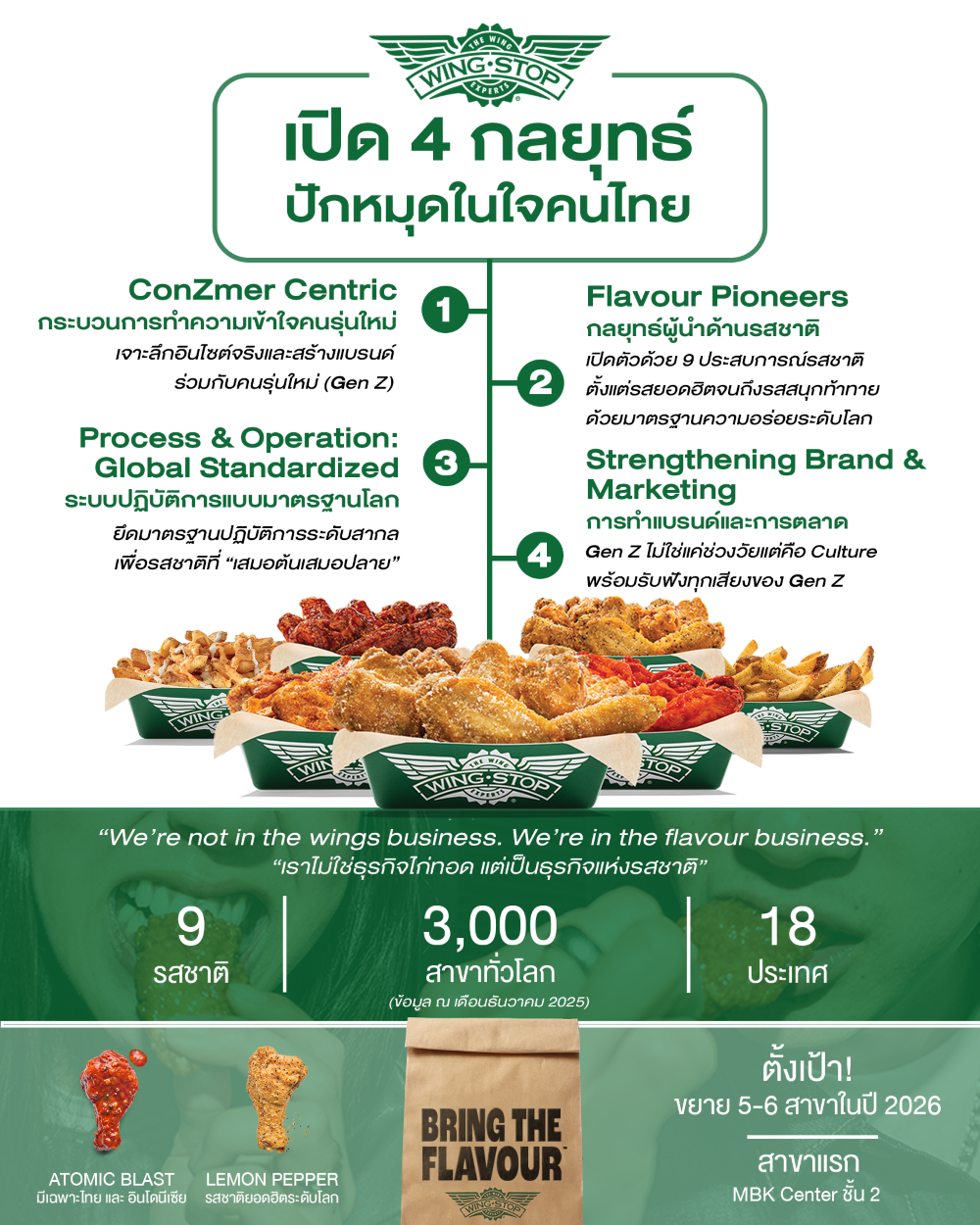 วิงสต๊อป (Wingstop)” แบรนด์อาหารชื่อดังระดับโลก เดินหน้าบุกตลาดไทยอย่างเป็นทางการด้วยการเปิดสาขาแรกที่ MBK Center ชั้น 2 หลังจากสร้างปรากฏการณ์มาแล้วใน 18 ประเทศ กว่า 3,000 สาขาทั่วโลก ประกาศจุดยืนที่แตกต่าง “เราไม่ใช่ธุรกิจไก่ทอด แต่เป็นธุรกิจแห่งรสชาติ” (flavour business) พร้อมนำประสบการณ์ด้านรสชาติในแบบฉบับของ Wingstop กว่า 9 รสมาเสิร์ฟให้ผู้บริโภคชาวไทยได้สัมผัสเป็นครั้งแรกตั้งแต่วันที่ 13 ธันวาคม 2568 เป็นต้นไป เปิดให้บริการทุกวันตั้งแต่เวลา 10.00–02.00 น. พร้อมเปิดกลยุทธ์เดินเกมเต็มกำลัง โดยตั้งเป้าเป็นแบรนด์ Top of Mind ของคนรุ่นใหม่ หรือ Gen Z ในปัจจุบัน พร้อมวางแผนขยายเพิ่ม 5-6 สาขาภายในปี 2026  โดยมี “เนม-ปราการ ไรวา” ที่รู้จักกันในฐานะนักร้องนำวง Getsunova ขึ้นแท่นผู้บริหารธุรกิจเต็มตัวครั้งแรก