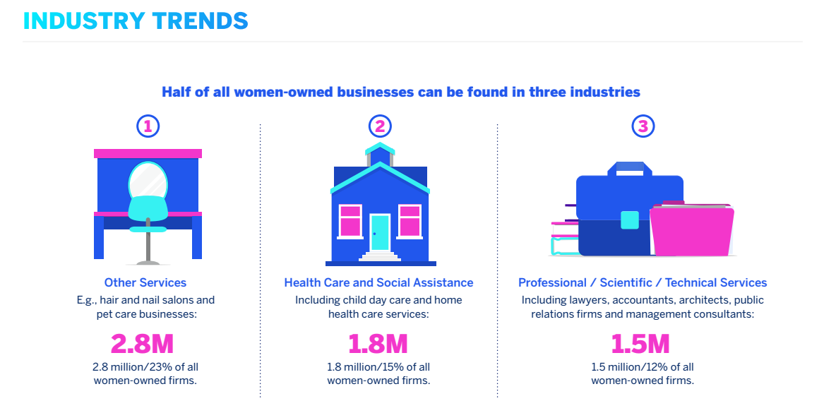 จากตัวเลขจะเห็นว่า ในช่วง 20 ปีที่ผ่านมา (ปี 1997 – 2017) จำนวนธุรกิจที่ผู้หญิงเป็นเจ้าของ มีอัตราการเติบโตสูงถึง 114% เมื่อเทียบกับ อัตราการเติบโตเท่ากับ 44% ของธุรกิจทั้งหมด โดยธุรกิจดังกล่าวอยู่ในอุตสาหกรรมบริการมากที่สุด สร้างรายได้กว่า 2.8 ล้านดอลลาร์สหรัฐ