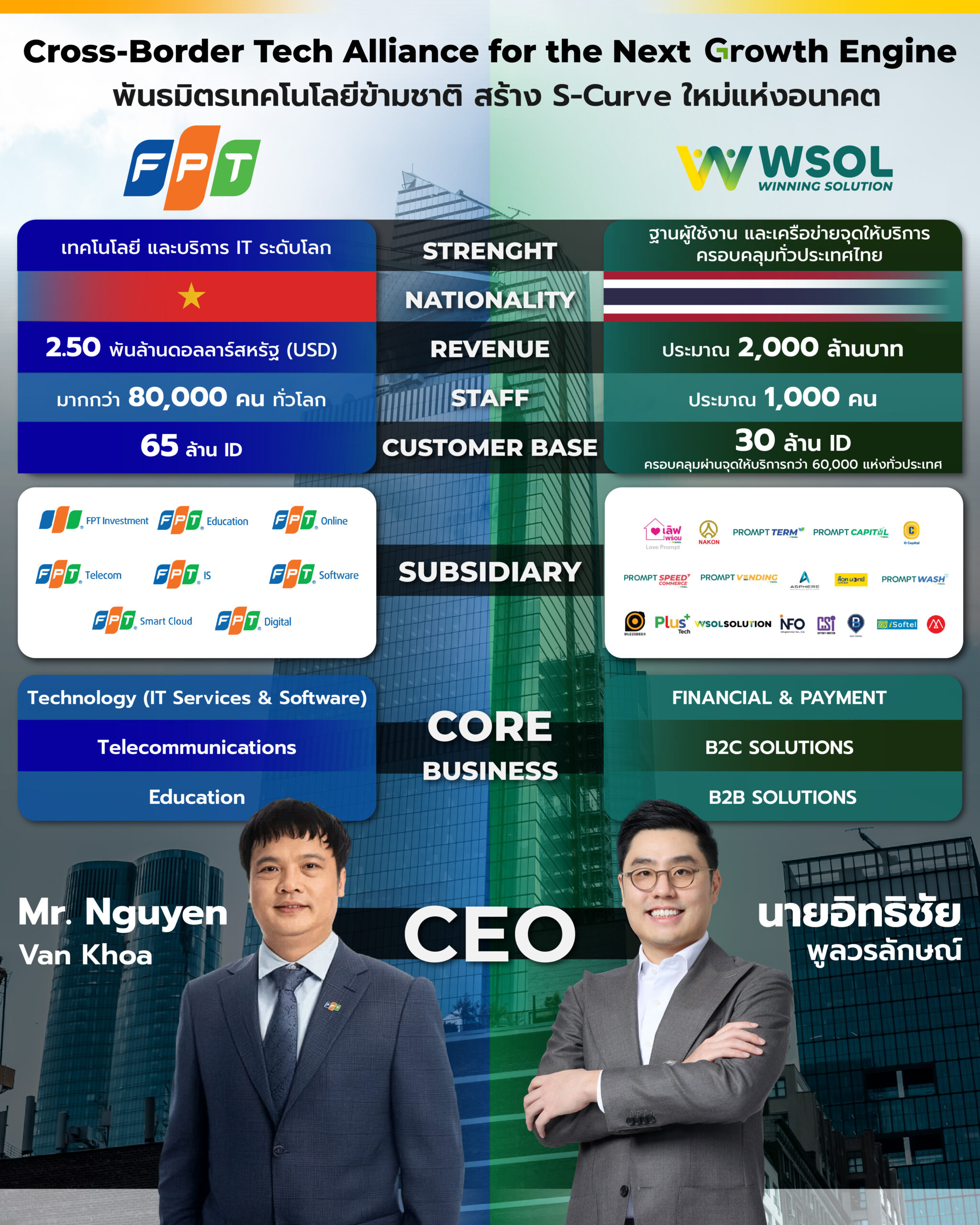 ขณะที่ WSOL มีเครือข่ายลูกค้าและจุดเชื่อมต่อบริการที่ครอบคลุมทั่วประเทศ ทั้งระบบชำระเงิน บริการทางการเงิน โครงสร้างร้านค้า รวมถึงพันธมิตรทางธุรกิจในหลายอุตสาหกรรม ส่งผลให้ WSOL ทำหน้าที่เป็น “Go-to-Market Gateway” ที่สำคัญในการขยายโอกาสนำเทคโนโลยีระดับภูมิภาคของ FPT เข้าสู่ตลาดประเทศไทยได้อย่างมีประสิทธิภาพ
