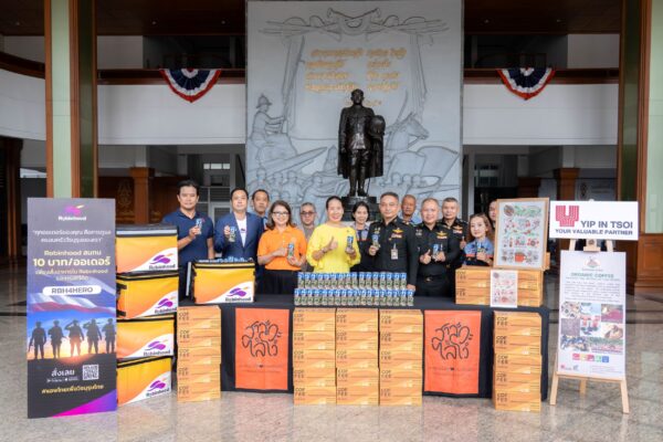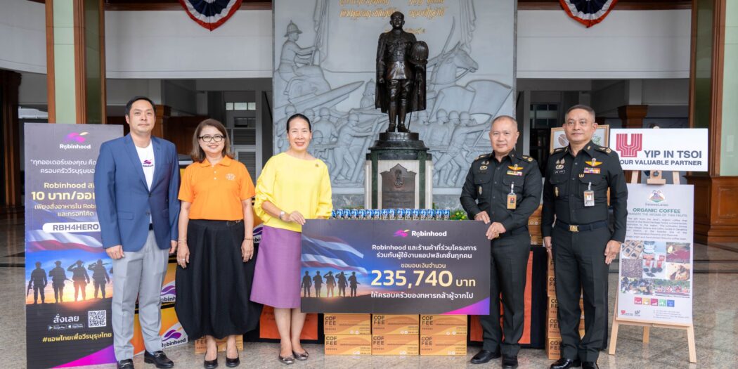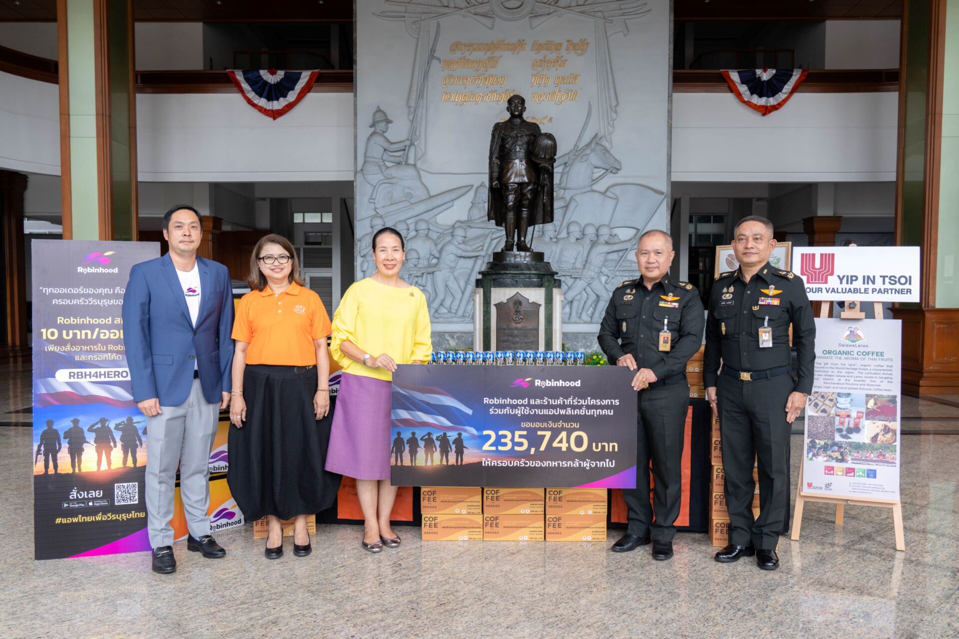 คุณมรกต ยิบอินซอย กรรมการผู้จัดการใหญ่และประธานเจ้าหน้าที่บริหาร (ที่ 3 จากซ้าย)  คุณแววรัตน์ ชำนาญภักดี ผู้อำนวยการสายงานทรัพยากรบุคคลและสื่อสารองค์กร (ที่ 2 จากซ้าย) บริษัท ยิบอินซอย จำกัด พร้อมทั้งผู้บริหาร คุณพงศ์ปณต อิงคสิทธิ์ ประธานเจ้าหน้าที่บริหารฝ่ายธุรกิจ Chief Commercial Officer (CCO) (ซ้ายสุด) โรบินฮู้ด เดลิเวอรี่  มอบกาแฟกระป๋องพร้อมดื่ม “กาแฟรักษ์ป่า” สาละวะไล่โว่ ซึ่งเป็นโครงการอันเนื่องมาจากพระราชดำริในรัชกาลที่ 9 “โครงการพัฒนาชุมชนโดยมูลนิธิภูบดินทร์” โดยมี พล.ต.สุรวิชญ์ แดงจันทร์ เสนาธิการกองทัพภาคที่ 1 (ขวาสุด) และ พล.ต.พิพัฒน์ จงวัฒนาไพศาล ผู้อำนวยการสำนักกิจการพลเรือน กรมกิจการพลเรือนทหารบก (ผอ.สกร.กร.ทบ.) (ที่ 2 จากขวา) เป็นผู้รับมอบ ณ กองบัญชาการกองทัพภาคที่ 1