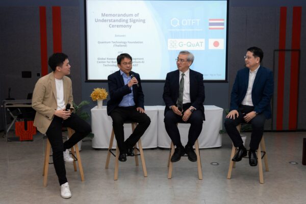 ดร.จิรวัฒน์ ตั้งปณิธานนท์ ประธานเจ้าหน้าที่บริหารและผู้ร่วมก่อตั้ง บริษัท Quantum Technology Foundation (Thailand) Co., Ltd. (QTFT) (ซ้าย) และศาสตราจารย์ มาซุ คาซูยะ ผู้อำนวยการศูนย์ G-QuAT สถาบันเทคโนโลยีอุตสาหกรรมขั้นสูงแห่งชาติ (AIST) ประเทศญี่ปุ่น (ขวา) ได้ลงนามในบันทึกความเข้าใจ (MOU) เพื่อร่วมกันพัฒนาเทคโนโลยี Quantum Computing สู่การใช้งานในภาคอุตสาหกรรมจริง โดยมีบริษัท ยิบอินซอย ทำหน้าที่เป็นตัวกลางสำคัญในการประสานความร่วมมือระหว่างภาคเทคโนโลยี ภาคการเงิน และภาครัฐ เพื่อให้ประเทศไทยสามารถนำควอนตัมคอมพิวติ้งเข้าสู่ระบบเศรษฐกิจได้อย่างเป็นรูปธรรมภายใต้กรอบความร่วมมือนี้ ทั้งสามฝ่ายจะร่วมกันดำเนินงานในหลายด้าน เช่น