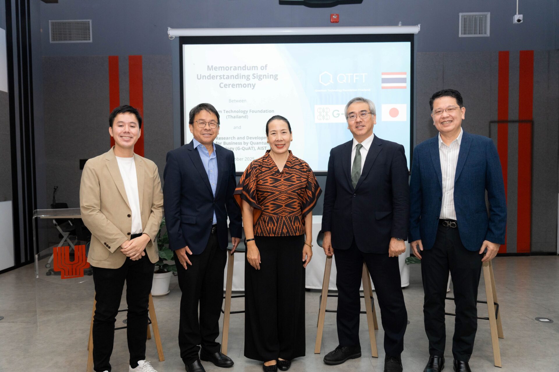 ดร.จิรวัฒน์ ตั้งปณิธานนท์ ประธานเจ้าหน้าที่บริหารและผู้ร่วมก่อตั้ง บริษัท Quantum Technology Foundation (Thailand) Co., Ltd. (QTFT) (ซ้าย) และศาสตราจารย์ มาซุ คาซูยะ ผู้อำนวยการศูนย์ G-QuAT สถาบันเทคโนโลยีอุตสาหกรรมขั้นสูงแห่งชาติ (AIST) ประเทศญี่ปุ่น (ขวา) ได้ลงนามในบันทึกความเข้าใจ (MOU) เพื่อร่วมกันพัฒนาเทคโนโลยี Quantum Computing สู่การใช้งานในภาคอุตสาหกรรมจริง โดยมีบริษัท ยิบอินซอย ทำหน้าที่เป็นตัวกลางสำคัญในการประสานความร่วมมือระหว่างภาคเทคโนโลยี ภาคการเงิน และภาครัฐ เพื่อให้ประเทศไทยสามารถนำควอนตัมคอมพิวติ้งเข้าสู่ระบบเศรษฐกิจได้อย่างเป็นรูปธรรมภายใต้กรอบความร่วมมือนี้ ทั้งสามฝ่ายจะร่วมกันดำเนินงานในหลายด้าน เช่น